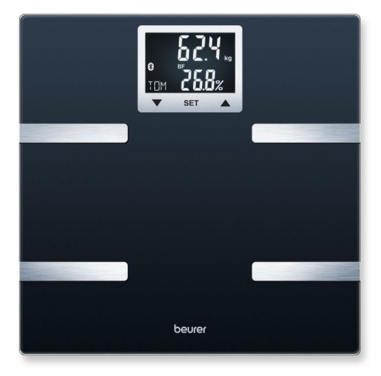 Везна Beurer BF 720 BT diagnostic bathroom scale in black, Weight, body fat, body water, muscle percentage, bone mass, AMR/BMR calorie display; BMI calculation; Black LCD display; white illumination with display of user's initials; Bluetooth; 180 kg / 100