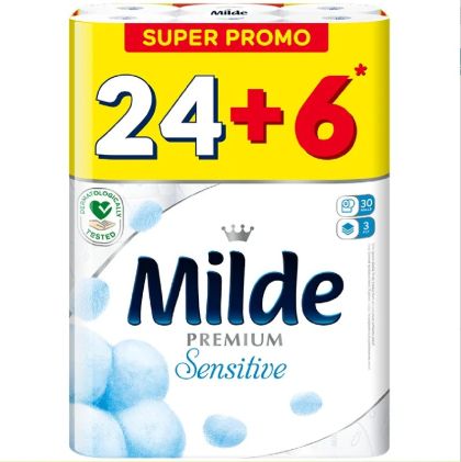 Тоалетна хартия Milde 100% целулоза, трипластова 24+6 бр. Sensitive