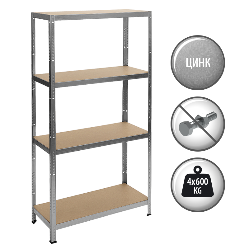 Carmen CR-1024 е стабилен стелаж от галванизиран метал с размери 180x90x40 см. С негова помощ ще подредите килера или гаража у дома, както и работното си пространство. Разполага с 4 МДФ рафта, всеки от които може да издържа на максимално натоварване от 600 кг. Благодарение на безболтовия монтаж височината на рафтовете може да бъде лесно регулирана и променяна. Пълна информация за размерите и характеристиките на модела ще намерите в таблицата в таб/поле "Техническа информация".