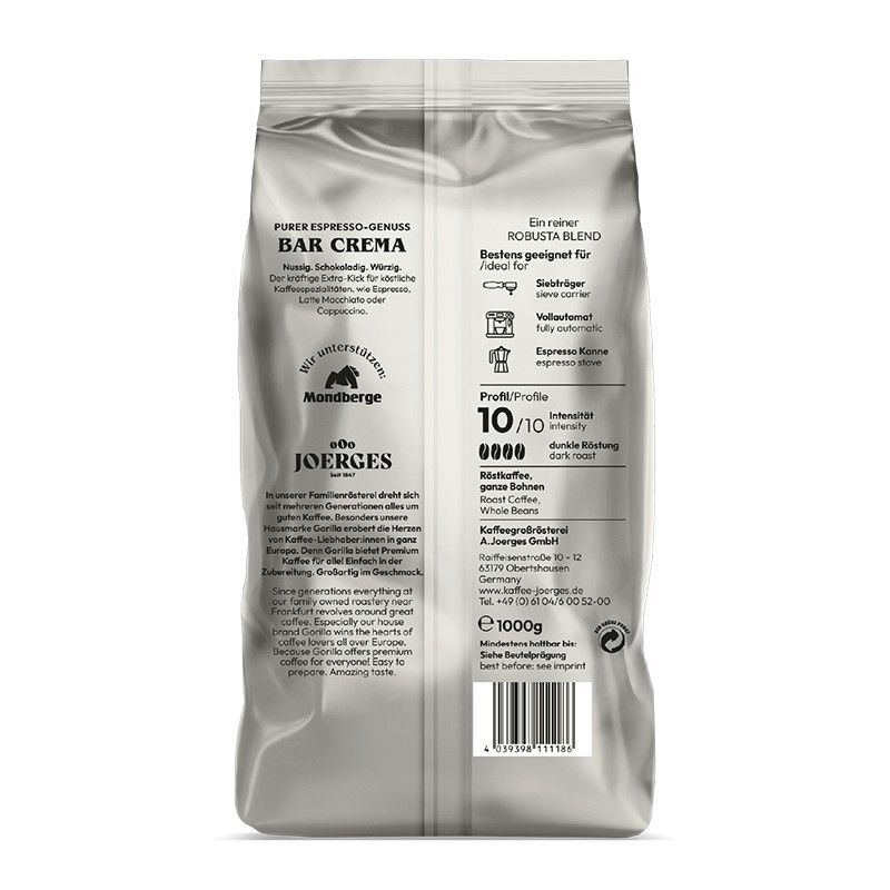 • Gorilla Bar Crema е чиста бленд от робуста. Ядкови и пикантни вкусове подчертават плътното тяло. Еспресото е с висока степен на интензивност благодарение на нежното тъмно изпичане на кафени зърна с един произход. Bar Crema се характеризира с особено стабилен и уникален каймак. Това прави това кафе толкова гладко. Bar Crema може да се приготвя на всички стандартни кафе машини, от портафилтърни до напълно автоматични.