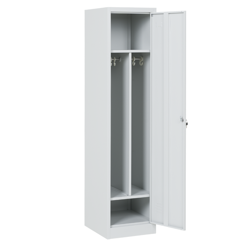 Carmen CR-1291 GR е метален шкаф, изработен от праховобоядисан метал. Единичният гардероб разполага с 2 рафта, като всеки от тях издържа на максимално натоварване до 40 кг. Възможността за заключване гарантира, че вещите ви ще бъдат на сигурно място. Пълна информация за размерите и характеристиките на модела ще намерите в таблицата в таб/поле "Техническа информация".