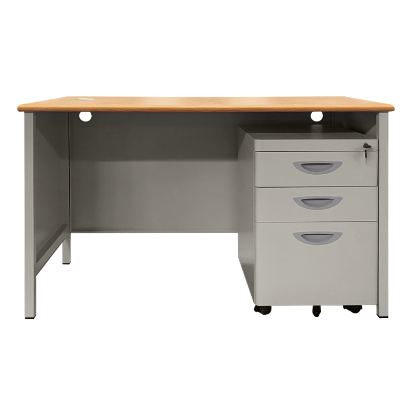 Металното бюро Carmen CR-1320 L комбинира стабилна конструкция с практичен дизайн. Изработено е от прахово боядисан метал с гладко покритие, а плотът му е от ПДЧ с дебелина 25 мм. Бюрото включва подвижен кардекс с три чекмеджета на колелца, който осигурява удобно място за съхранение. Моделът разполага с отвор за кабели и функция за заключване. Цветът е светлосив с плот в цвят бук, подходящ за всяка модерна офис среда. Пълна информация за размерите и характеристиките на модела ще намерите в таблицата в таб/поле "Техническа информация".