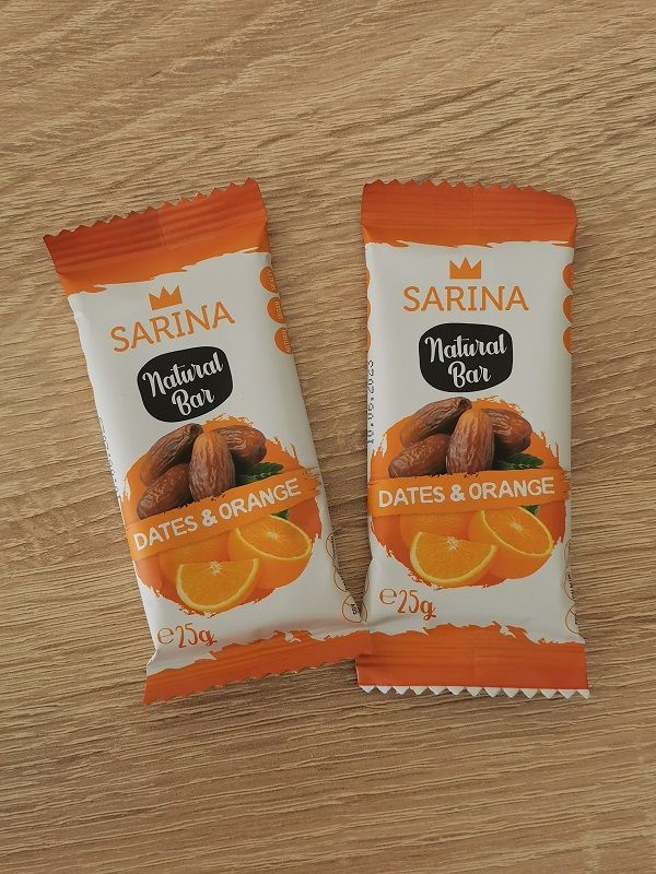 Съставки: Фурми 72%, бадеми, кокосови стърготини, портокалово масло (органично) -0,01%, сол. Може да съдържа следи от костилки.