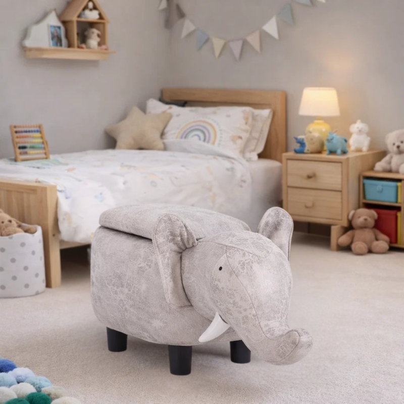 Детската табуретка под формата на сив слон е чудесен начин да зарадвате своето дете. Това чаровно слонче ще се превърне в неговото любимо място за сядане и верен приятел за игри, а удобната ракла във вътрешността му ще бъде неговото скривалище за играчки. Пълна информация за размерите и характеристиките на модела ще намерите в таблицата в таб/поле "Техническа информация".
